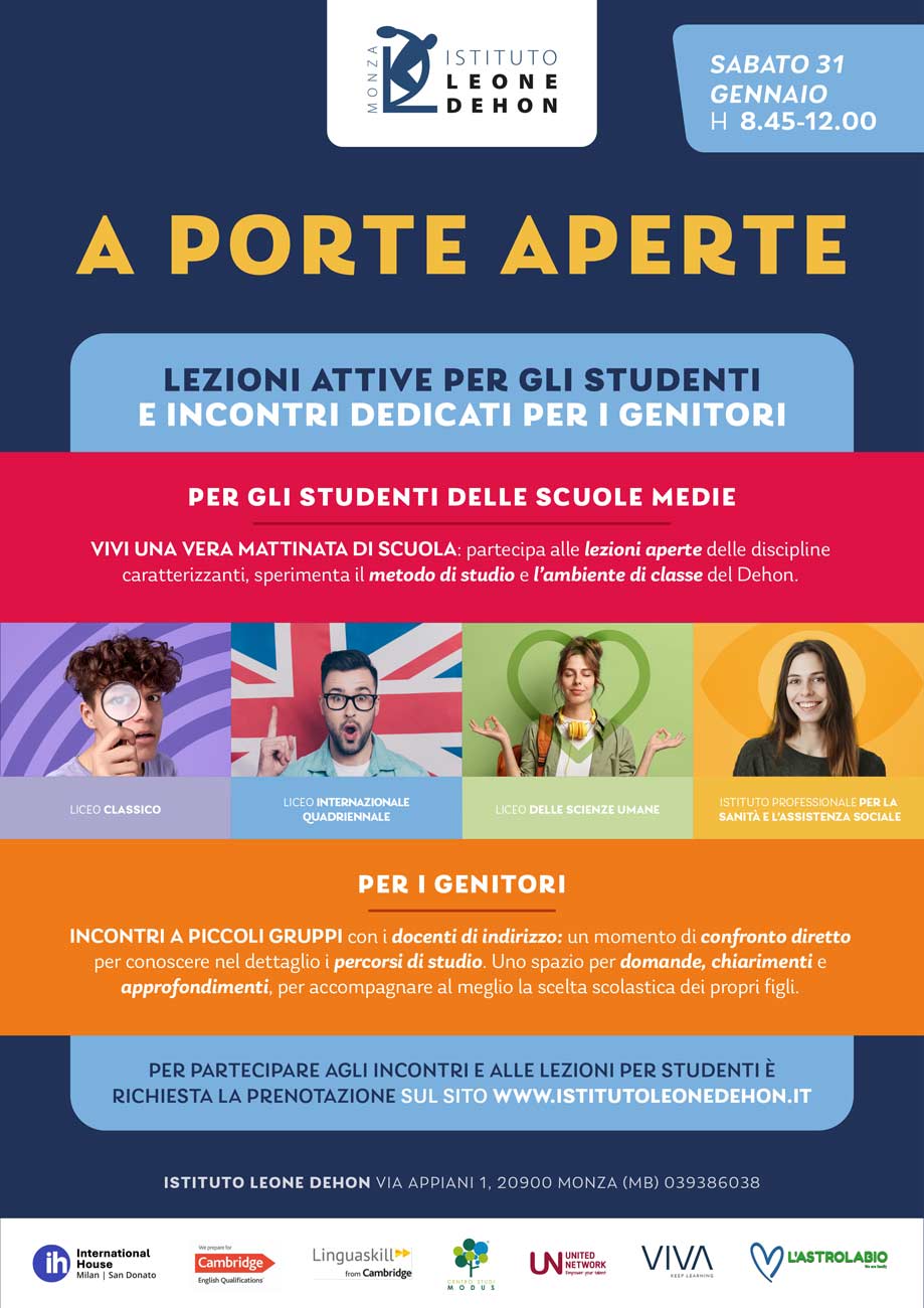 Mentre le ragazze e i ragazzi saranno impegnati nelle attività didattiche, i genitori potranno approfondire la conoscenza dell’offerta formativa attraverso incontri dedicati in piccoli gruppi e visitare la struttura. Un docente sarà a disposizione per illustrare il piano di studi e rispondere a domande specifiche.
